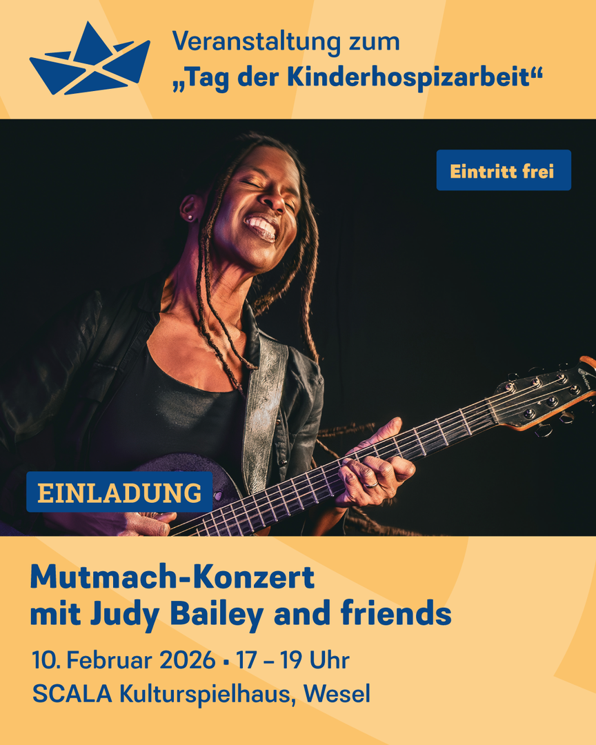 Am 10. Februar ist der deutsche Tag der Kinderhospizarbeit. Dieser Tag lädt ein, an all jene Menschen zu denken die sich mit ihrer Arbeit in Kinderhospizen einbringen, aber auch an alle betroffenen Menschen und Familien zu denken. Ankerplatz ist der ambulante Kinder- und Jugendhospizdienst der Hospiz-Initiative-Wesel. Als Zeichen der Solidarität mit Familien, in denen kranke Kinder, Jugendliche und Erwachsene leben, veranstaltet Ankerplatz am 10.02.2026 ein Mutmach-Konzert. Hierfür konnte die Künstlerin Judy Bailey and friends gewonnen werden. Judy Bailey wurde mit christlichen Popsongs bekannt, die voller Liebe, Lob und Leben sind. Ihre Lieder streicheln die Seele und lassen den Alltag vergessen. Die Veranstaltung wird gefilmt und aufgezeichnet, um anschließend an alle Menschen geschickt zu werden, die gerade Mut brauchen. Das Konzert mit Judy Bailey findet am 10. Februar von 17 – 19 Uhr im SCALA Kulturspielhaus statt. Der Eintritt ist frei, um Anmeldung wird unter folgender Emailadresse gebeten: marquardt@hospiz-wesel.de.